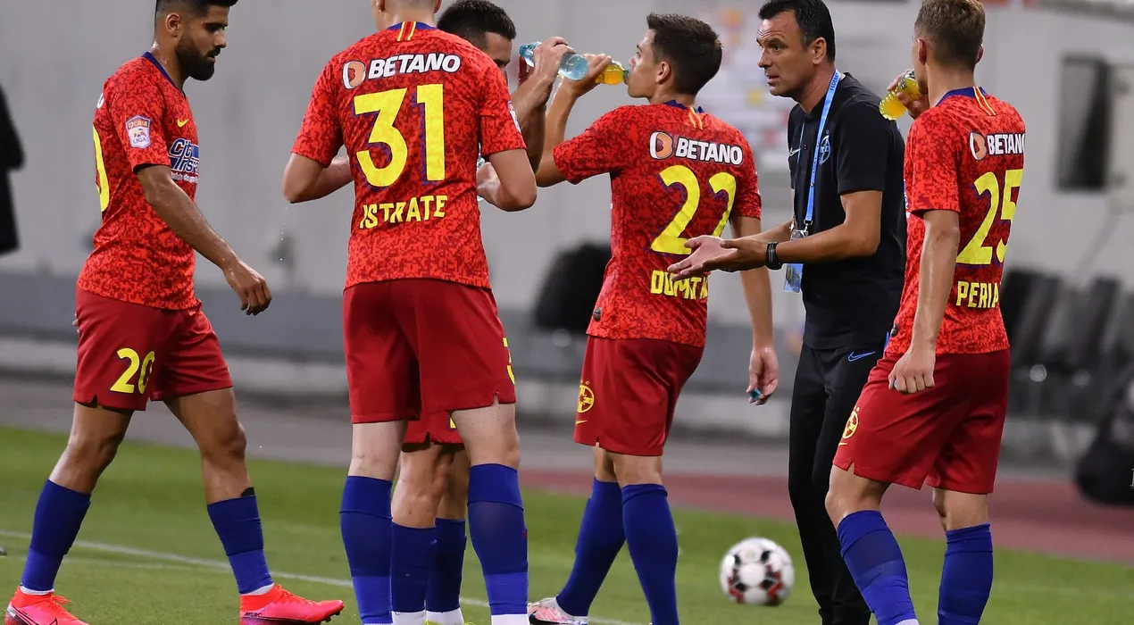 Toni Petrea alaturi de elevii sai Ionut Vina si Cristian Cosmin Dumitru la o pauza de hidratare in meciul de fotbal dintre FCSB si CFR Cluj, contand pentru play-off-ul Ligii 1 Casa Pariurilor, disputat fara spectatori pe Arena Nationala din Bucuresti, vineri 31 iulie 2020. © FOTO:Razvan Pasarica/SPORT PICTURES