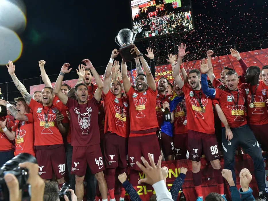 Bucurie clujeana cu George Daniel Birligea, Mario Camora, Andonie Andrei Burca, Billel Abdel Slem Omrani, Cristian Marian Manea, Florin Bogdan Stefan si Bismark Adjei Boateng dupa castigarea campionatului in urma meciului de fotbal dintre CFR Cluj si Universitatea Craiova, contand pentru Play-off-ul Ligii 1 Casa Pariurilor, desfasurat pe Stadionul CFR Dr. Constantin Radulescu din Cluj Napoca, duminica 15 mai 2022. © FOTO:Razvan Pasarica/SPORT PICTURES