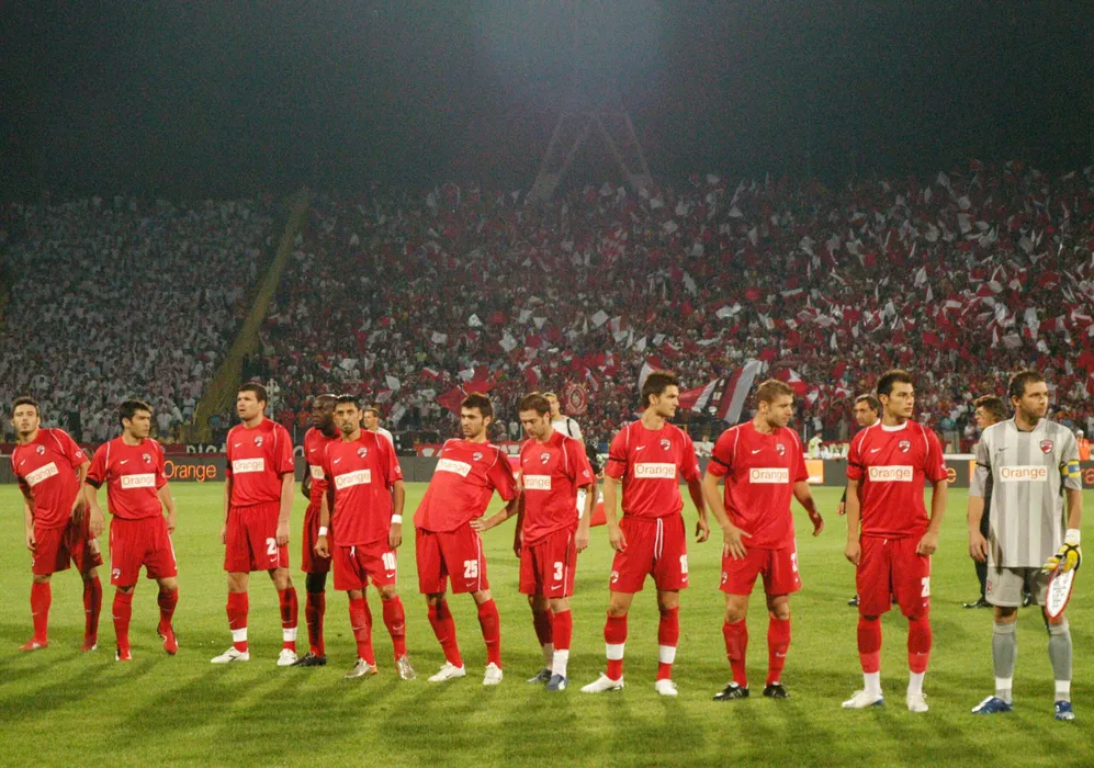 Dinamo Bucuresti saluta publicul la inceputul partidei.De la stanga la dreapta:Adrian Cristea,Andrei Margaritescu,Daniel Oprita,George Blay,Ionel Danciulescu,Adrian Ropotan,Cristian Pulhac,Florin Bratu,Valentin Nastase,Radu Stefan si Bogdan Lobont.