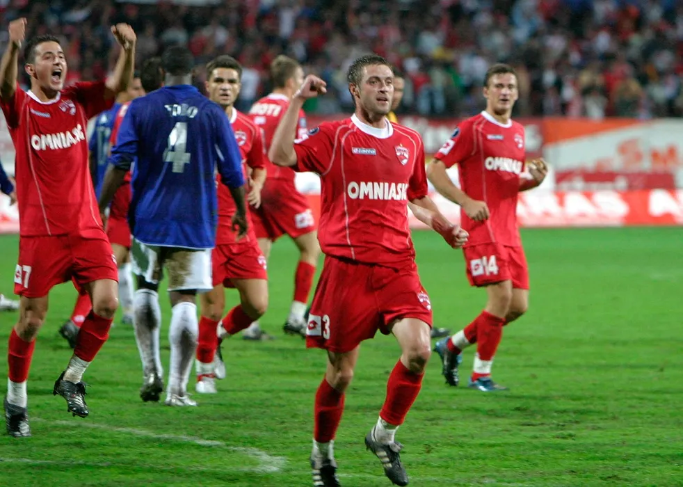 FC Dinamo Bucharest's team celebrates shortly after the end of the match again FC Everton, during the UEFA football cup match first leg, first round in Bucharest, 15 September 2005. Dinamo won with 5-1.,Image: 17086835, License: Rights-managed, Restrictions: , Model Release: no