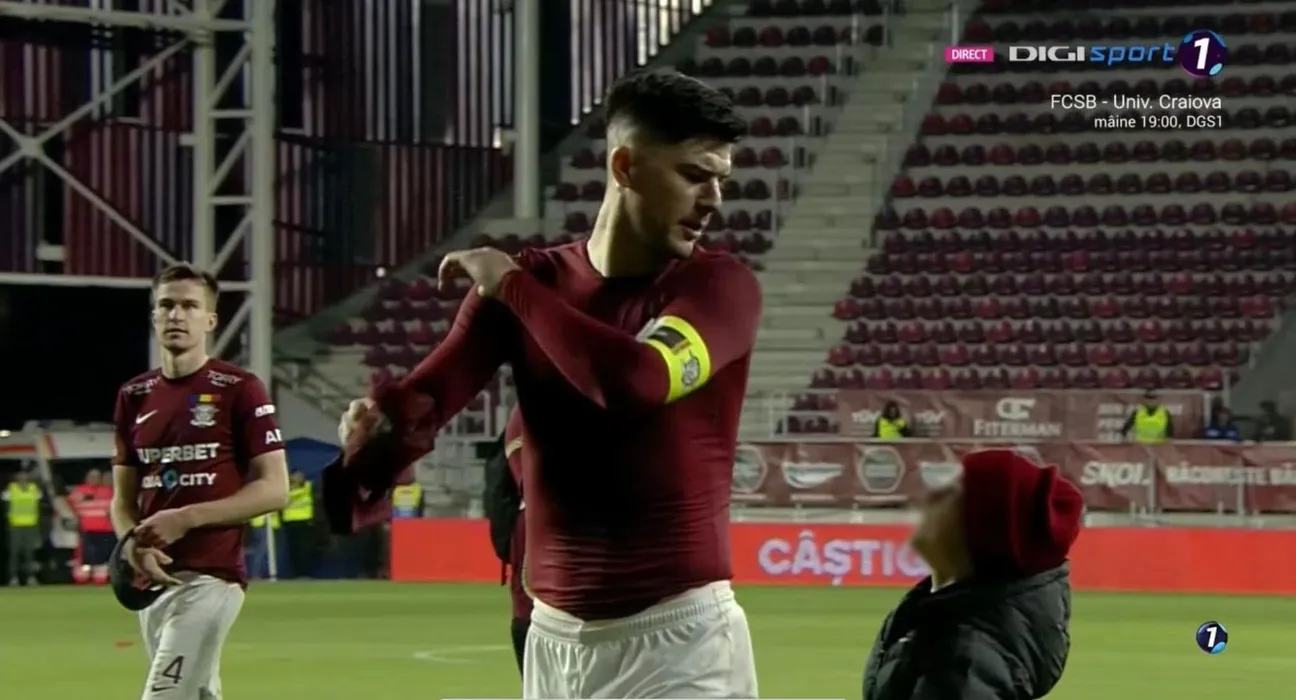 Cristi Săpunaru a reacționat nervos când un copil a vrut să îi ia banderola! Cum l-a făcut apoi puștiul pe căpitanul Rapidului să râdă| VIDEO