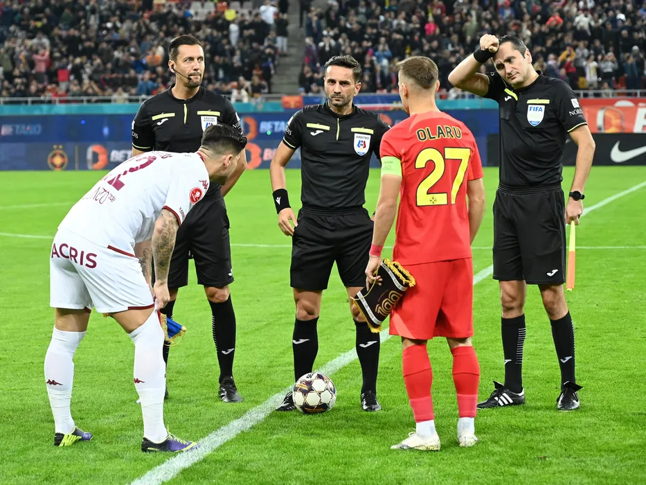 Brigada de arbitrii formata din Sebastian Eugen Gheorghe, Sebastian Coltescu si Daniel Mitruti alaturi de capitanii Cristian Ionut Sapunaru si Darius Dumitru Olaru in meciul de fotbal dintre FCSB si Rapid Bucuresti, din cadrul Superligii Superbet, desfasurat pe Arena Nationala din Bucuresti, duminica 5 noiembrie 2023. © FOTO:Razvan Pasarica/SPORT PICTURES