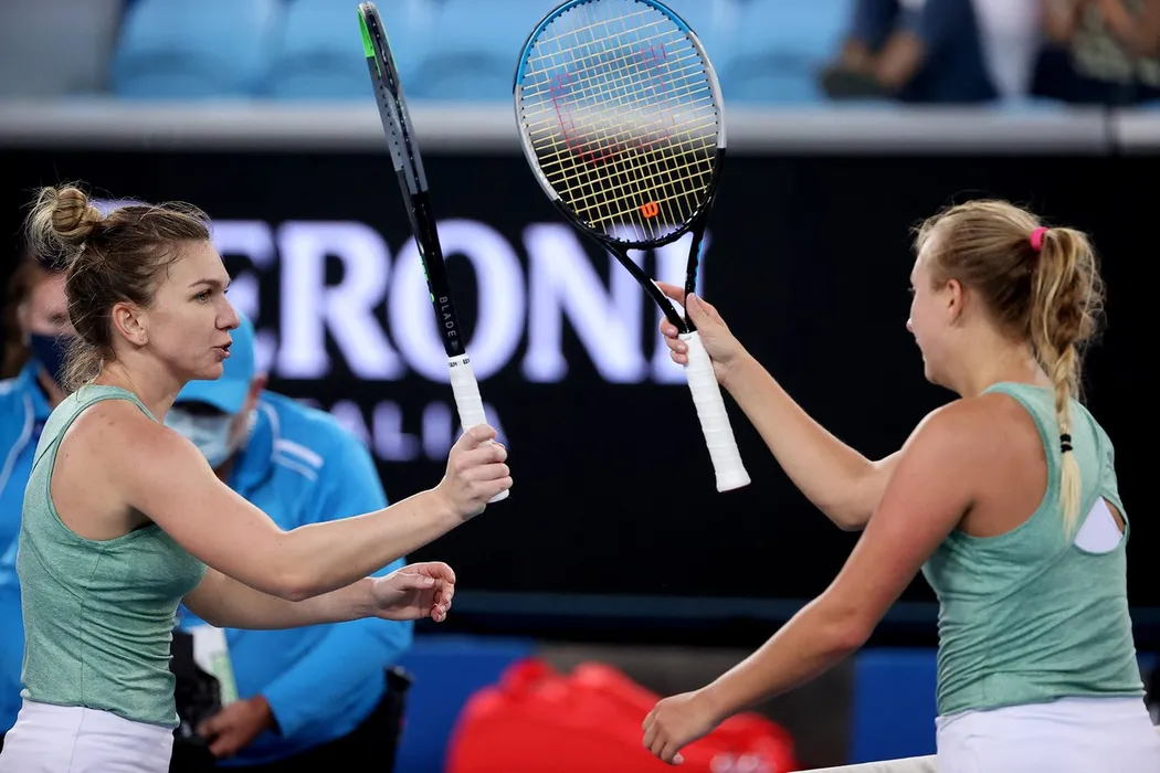Simona Halep of Romania (L) and Anastasia Potapova of Russia touch the rackets after their second round Gippsland Trophy women's singles tennis match in Melbourne on February 1, 2021.,Image: 587797081, License: Rights-managed, Restrictions: -- IMAGE RESTRICTED TO EDITORIAL USE - STRICTLY NO COMMERCIAL USE --, Model Release: no, Credit line: Profimedia