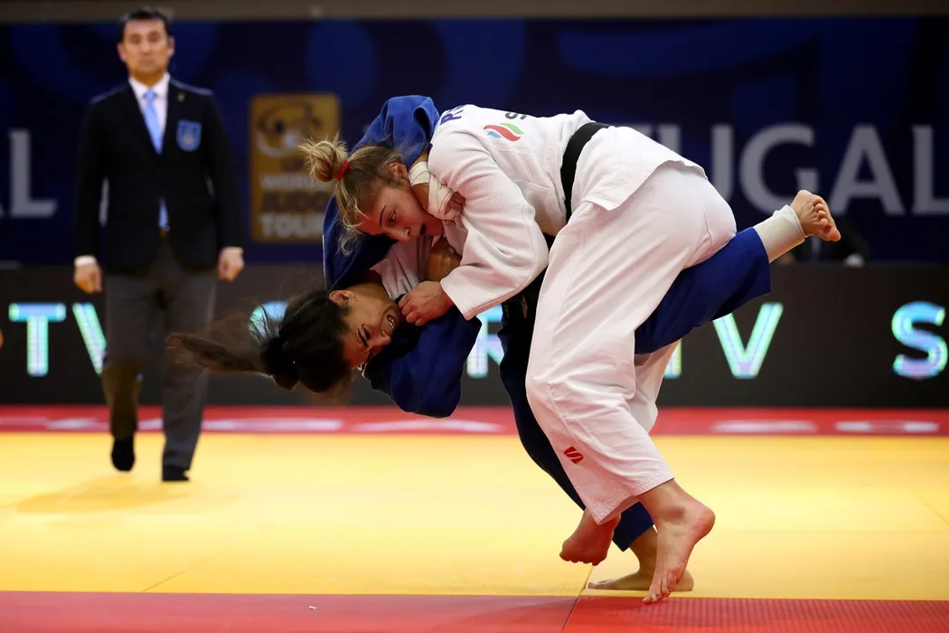 January 29, 2022, Almada, Portugal: Cristina Cabana Perez of Spain (blue) competes against Florentina Ivanescu of Romania (white) in the women's less 63 kg weight category bronze medal during the Judo Portugal Grand Prix 2022 at the Municipal Sports Complex in Almada, Portugal on January 29, 2022.,Image: 657667927, License: Rights-managed, Restrictions: , Model Release: no, Credit line: Profimedia