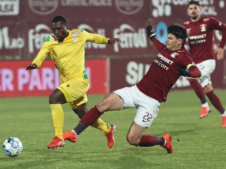 Sanoh Moussa si Cristian Sapunaru in meciul de fotbal dintre Rapid Bucuresti si CS Mioveni, contand pentru Liga 1 Casa Pariurilor, desfasurat pe stadionul Orasenesc din Mioveni, sambata 27 noiembrie 2021. © FOTO:Gheorghe Fluster/SPORT PICTURES