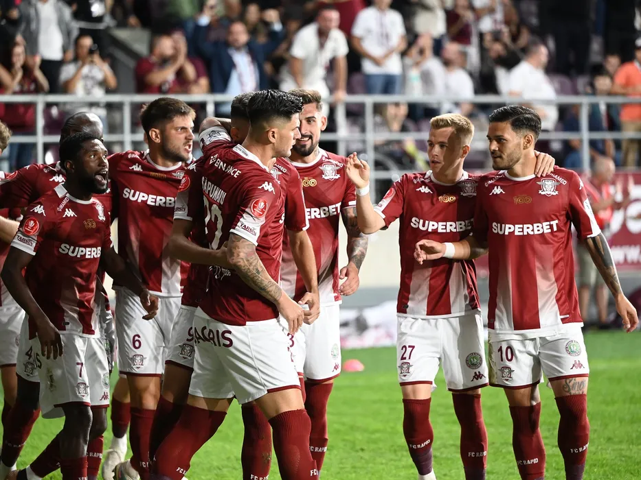 Bucurie a fotbalistilor rapidisti dupa un gol marcat cu Funsho Ibrahim Bamgboye, Paul Alexandru Iacob, Cristian Ionut Sapunaru, Alexandru Cristian Albu, Claudiu Adrian Mihai Petrila si Alexandru Ionita in meciul de fotbal dintre Rapid Bucuresti si CFR Cluj, din cadrul Superligii Superbet, desfasurat pe Superbet Arena-Giulesti din Bucuresti, luni 25 septembrie 2023. © FOTO:Razvan Pasarica/SPORT PICTURES