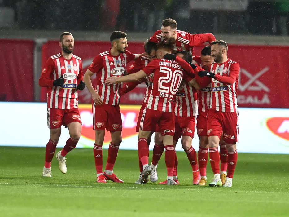 Bucurie a fotbalistilor de la Sepsi dupa un gol marcat cu Nicolae Ionut Paun, Alexandru Tudorie si Radoslav Dimitrov in meciul de fotbal dintre Sepsi OSK Sfantu Gheorghe si FCSB, contand pentru Play-off-ul Superligii Superbet, desfasurat pe Sepsi Arena din Sfantu Gheorghe, luni 3 aprilie 2023. © FOTO:Razvan Pasarica/SPORT PICTURES