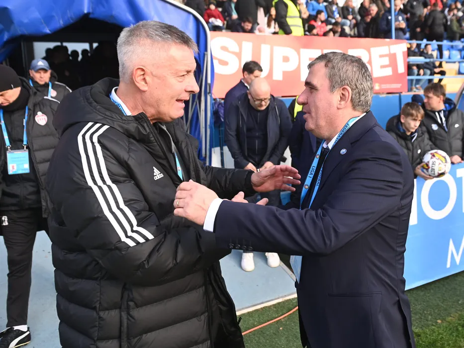 Cei doi antrenori Cristiano Bergodi si Gheorghe Hagi se saluta inaintea meciului de fotbal dintre Farul Constanta si Sepsi OSK Sfantu Gheorghe, contand pentru Play-off-ul Superligii Superbet, desfasurat pe Stadionul central al Academiei Gheorghe Hagi din Ovidiu, duminica 19 martie 2023. © FOTO:Razvan Pasarica/SPORT PICTURES