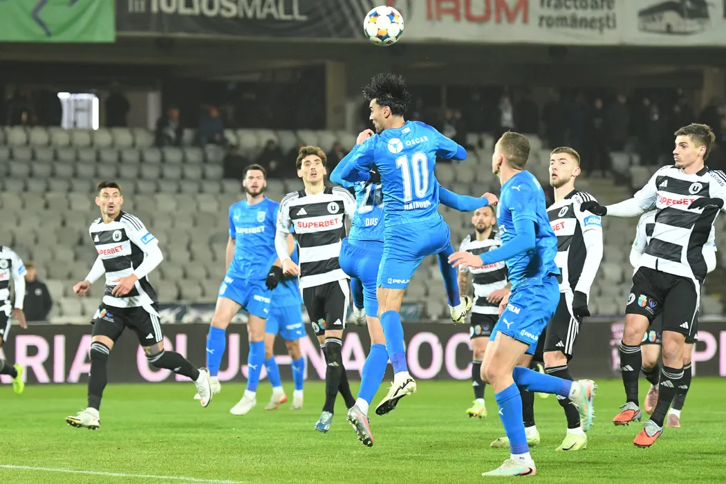Stefan Baiaram, Oleksandr Romanchuk si Miguel Angelo Gomes Silva, Gabriel Bogdan Simion in meciul de fotbal dintre FC Universitatea Cluj si Universitatea Craiova, contand pentru Superliga Superbet, desfasurat pe Cluj Arena din Cluj-Napoca, luni 1 decembrie 2025. © FOTO:Flaviu Buboi/SPORT PICTURES
