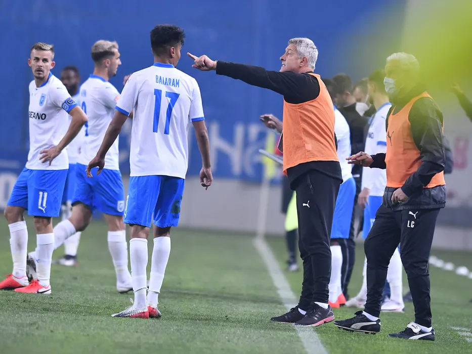 Nicusor Silviu Bancu si Cristiano Bergodi in meciul de fotbal dintre Universitatea Craiova si Academica Clinceni, contand pentru Liga 1 Casa Pariurilor, desfasurat fara spectatori pe Stadionul Ion Oblemenco din Craiova, vineri 23 octombrie 2020. © FOTO:Razvan Pasarica/SPORT PICTURES