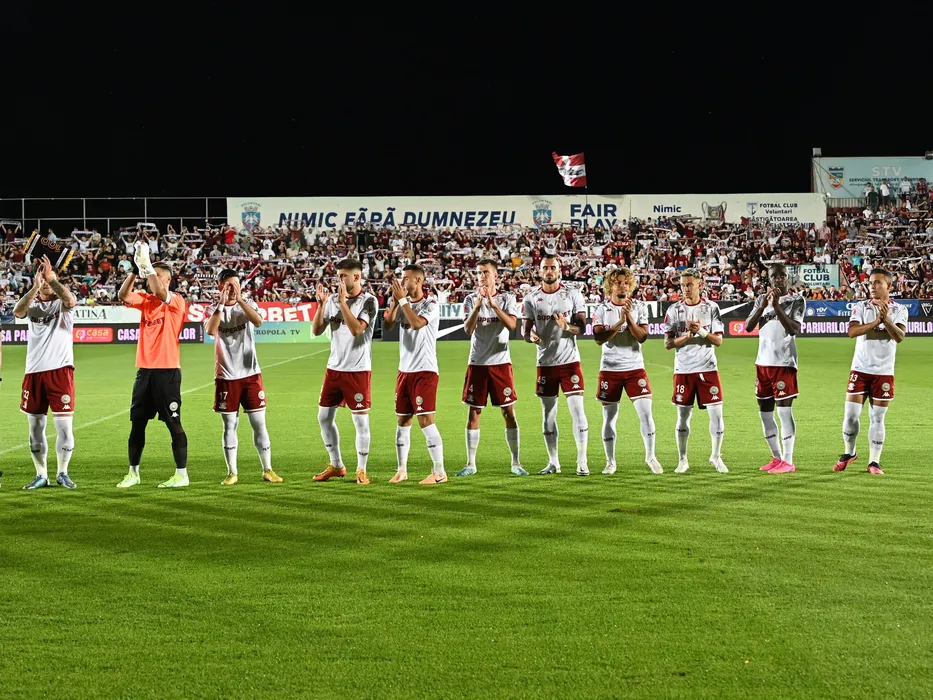 Fotbalistii rapidisti la startul meciului de fotbal dintre FC Voluntari si Rapid Bucuresti, din cadrul Superligii Superbet, desfasurat pe Stadionul Anghel Iordanescu din Voluntari, luni 7 august 2023. © FOTO:Razvan Pasarica/SPORT PICTURES