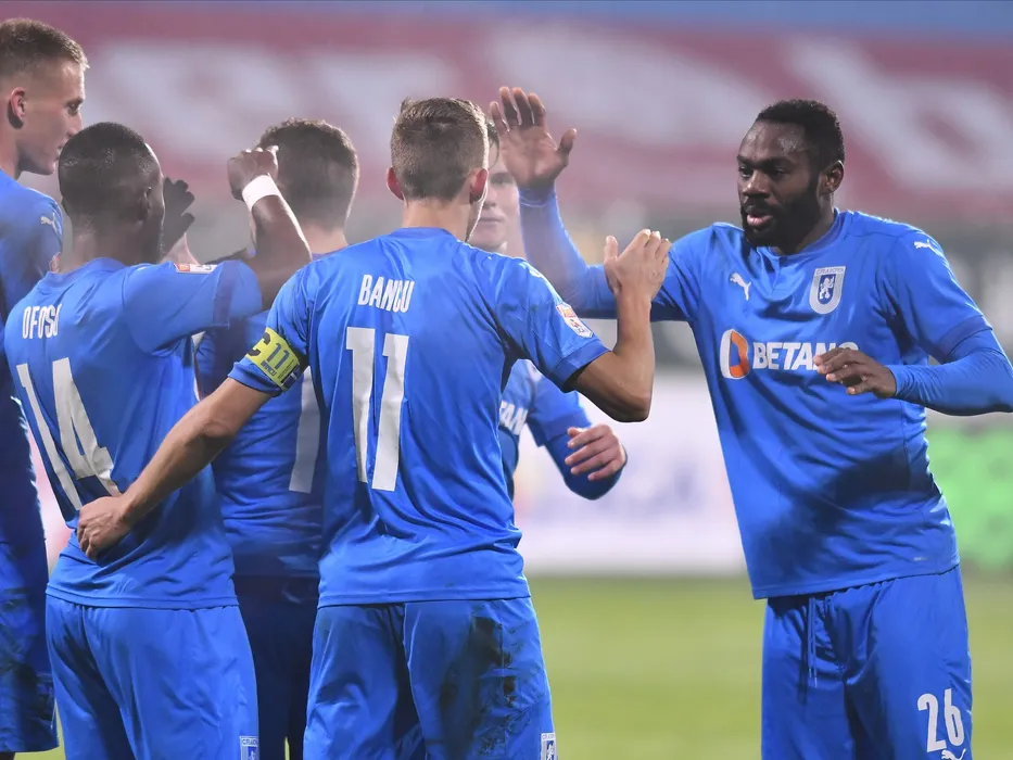 Stephane Ghislain Acka il felicita pe Nicusor Silviu Bancu dupa un gol marcat in meciul de fotbal dintre FC Hermannstadt si Universitatea Craiova, contand pentru Liga 1 Casa Pariurilor, desfasurat fara spectatori pe Stadionul Municipal din Medias, sambata 31 octombrie 2020. © FOTO:Razvan Pasarica/SPORT PICTURES