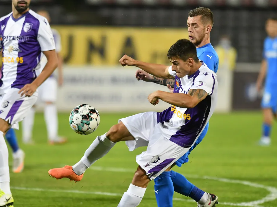 Costinel Andrei Tofan si Alexandru Cicaldau in meciul de fotbal dintre FC Arges si Universitatea Craiova, contand pentru Liga 1 Casa Pariurilor, desfasurat fara spectatori pe Stadionul Nicolae Dobrin din Pitesti, vineri 25 septembrie 2020. © FOTO:Razvan Pasarica/SPORT PICTURES