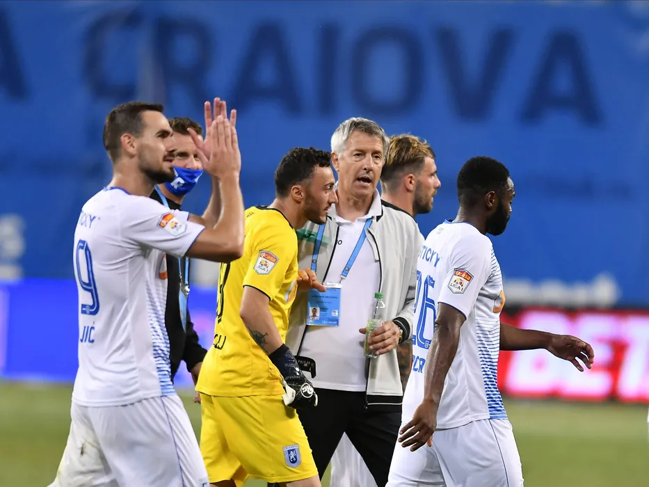Fotbalistii Craiovei Mirko Pigliacelli, Elvir Koljic si Stephane Acka sunt felicitati de catre Cristiano Bergodi dupa meciul de fotbal dintre Universitatea Craiova si Astra Giurgiu, contand pentru play-off-ul Ligii 1 Casa Pariurilor, disputat fara spectatori pe Stadionul Ion Oblemenco din Craiova, vineri 19 iunie 2020. © FOTO:Razvan Pasarica/SPORT PICTURES