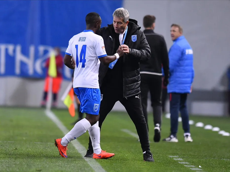 Reagy Ofosu si Cristiano Bergodi in meciul de fotbal dintre Universitatea Craiova si Chindia Targoviste, contand pentru Liga 1 Casa Pariurilor, desfasurat fara spectatori pe Stadionul Ion Oblemenco din Craiova, vineri 6 noiembrie 2020. © FOTO:Razvan Pasarica/SPORT PICTURES