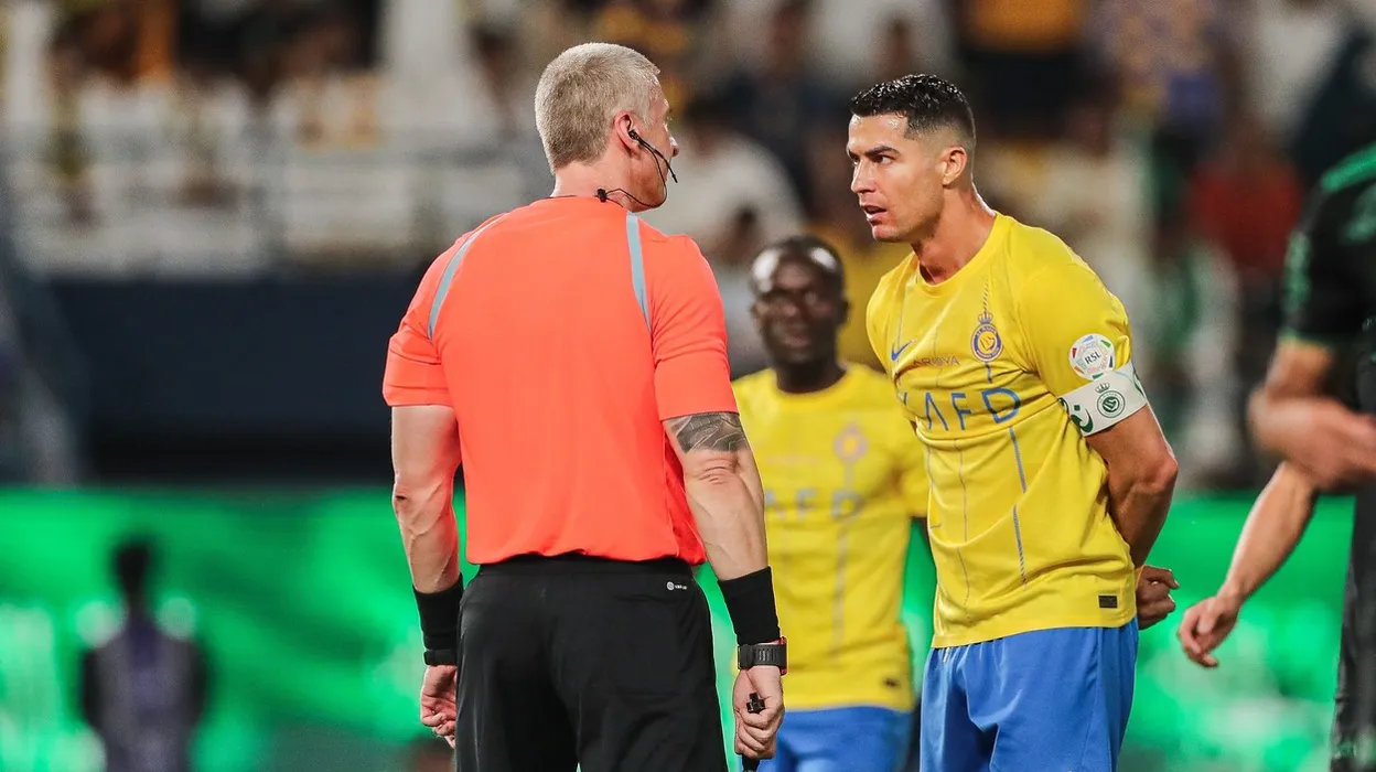 Cristiano Ronaldo of Al-Nassr SFC gestures to referee Anderson Daronco
