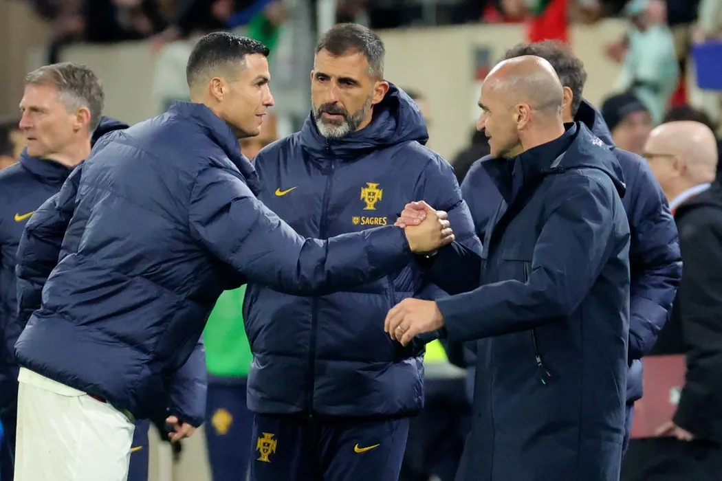 Portugal's Cristiano Ronaldo, left, shakes hands with Portugal's coach Roberto Martinez during the Euro 2024 group J qualifying soccer match between Luxembourg and Portugal at the Stade de Luxembourg in Luxembourg, Sunday, March 26, 2023.,Image: 765335368, License: Rights-managed, Restrictions: This content is intended for editorial use only. For other uses, additional clearances may be required., Model Release: no, Pictured: Cristiano Ronaldo