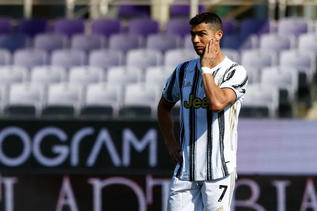 FLORENCE, ITALY - APRIL 25: (BILD ZEITUNG OUT) Cristiano Ronaldo of Juventus looks dejected during the Serie A match between ACF Fiorentina and Juventus at Stadio Artemio Franchi on April 25, 2021 in Florence, Italy. Sporting stadiums around Italy remain under strict restrictions due to the Coronavirus Pandemic as Government social distancing laws prohibit fans inside venues resulting in games being played behind closed doors. (Photo by Matteo Ciambelli/DeFodi Images via Getty Images)