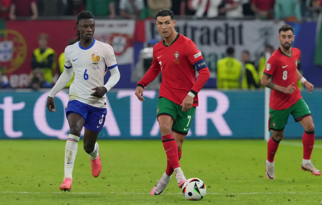 05 July 2024, Hamburg: France's Eduardo Camavinga (L) and Portugal's Cristiano Ronaldo battle for the ball during the UEFA EURO 2024 quarter-final soccer match between Portugal and France at the Volksparkstadion Hamburg. Photo: Sören Stache/dpa/HEPTA/SPORT PICTURES