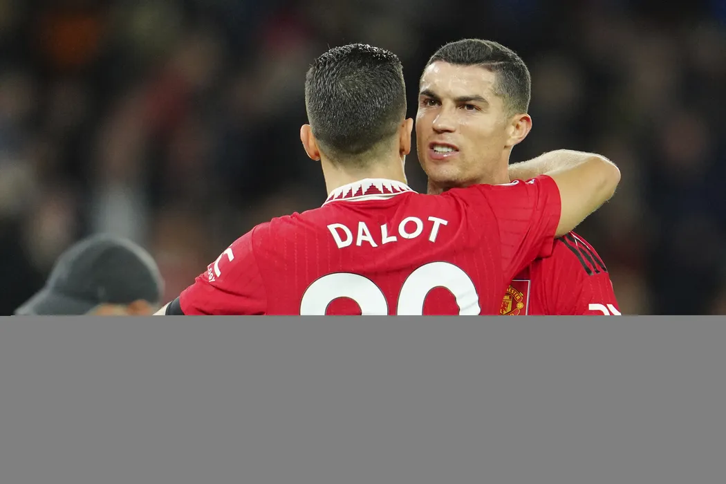 Manchester United's Diogo Dalot, foreground. And Manchester United's Cristiano Ronaldo celebrate at the end of the English Premier League soccer match between Manchester United and West Ham United at Old Trafford stadium in Manchester, England, Sunday, Oct. 30, 2022. (AP Photo/Jon Super)