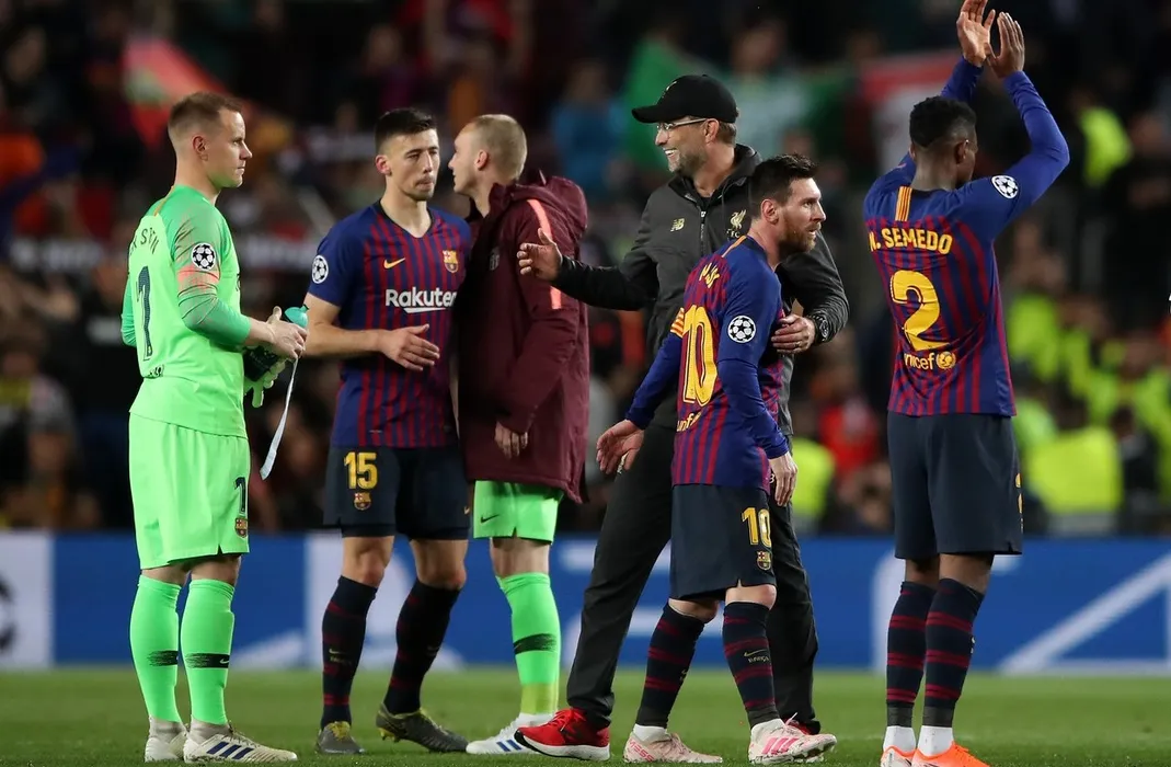 Liverpool manager Jurgen Klopp congratulates Barcelona's Lionel Messi after the UEFA Champions League semi final first leg match at the Nou Camp, Barcelona.,Image: 430249702, License: Rights-managed, Restrictions: , Model Release: no