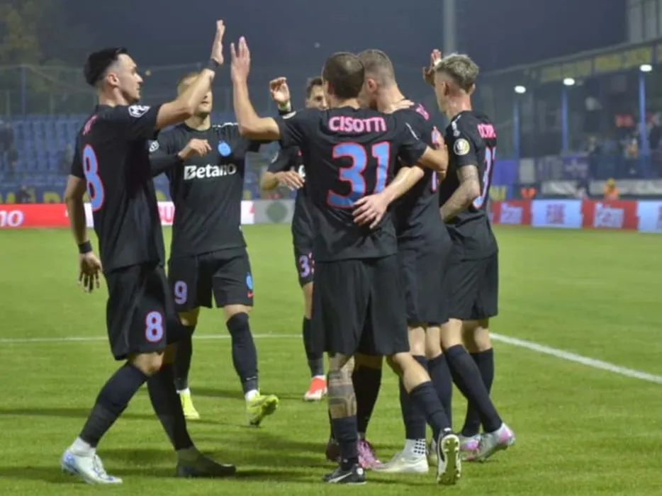 Fotbalistii ros-albastrii se bucura dupa un gol marcat in meciul de fotbal dintre Metaloglobus Bucuresti si FCSB, contand pentru Superliga Superbet, desfasurat pe Clinceni Arena din Clinceni, sambata 18 octombrie 2025. © FOTO:Alexandra Cristina Grigorescu/SPORT PICTURES