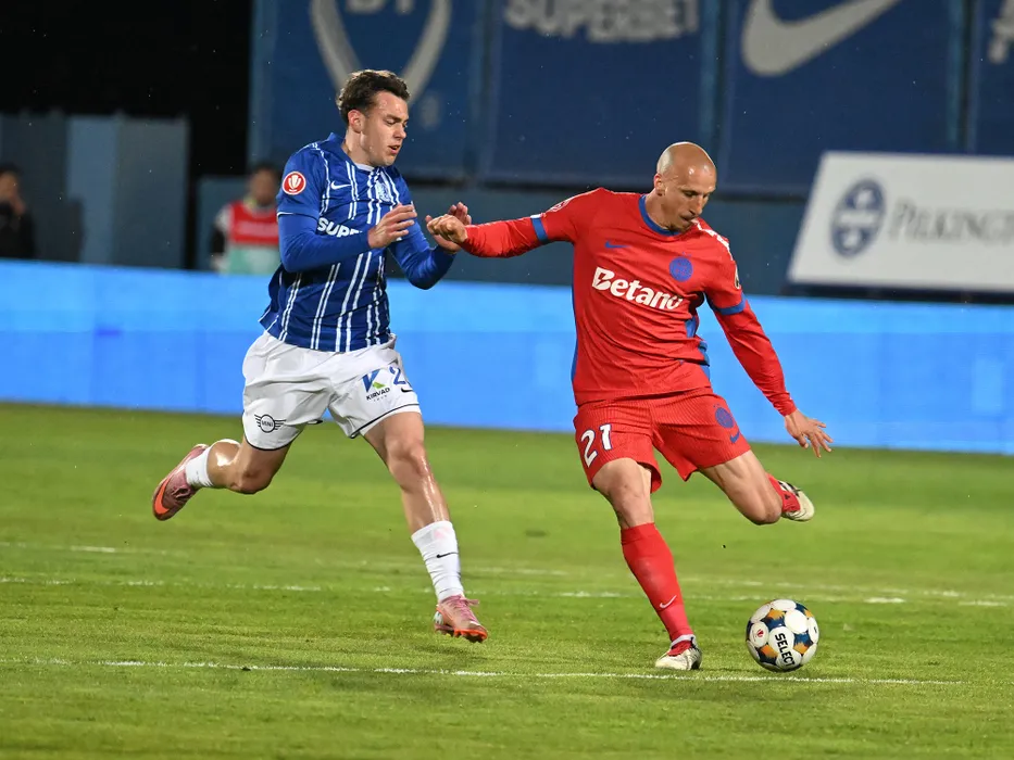 Eduard Gabriel Radaslavescu si Vlad Iulian Chiricheș in meciul de fotbal dintre Farul Constanta si FCSB, contand pentru Play out-ul Superligii Superbet, desfasurat pe Stadionul central al Academiei Gheorghe Hagi din Ovidiu, duminica 20 aprilie 2026. © FOTO:Razvan Pasarica/SPORT PICTURES