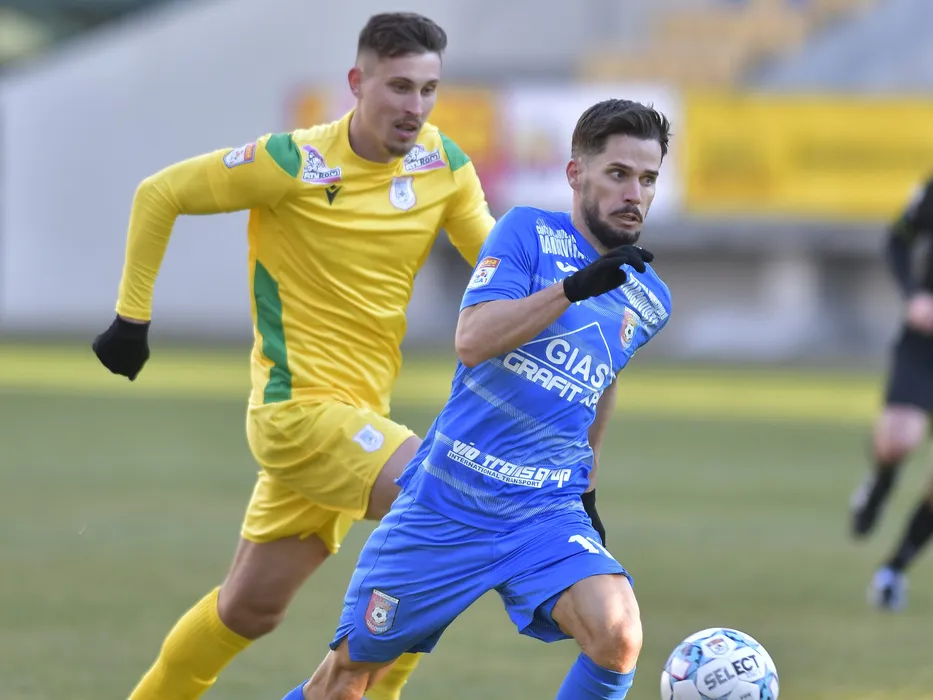 Guilherme Gomes Garutti si Daniel Constantin Florea in meciul de fotbal dintre Chindia Targoviste si CS Mioveni, contand pentru Liga 1 Casa Pariurilor, desfasurat pe Stadionul Ilie Oana din Ploiesti, duminica 30 ianuarie 2022. © FOTO:Razvan Pasarica/SPORT PICTURES