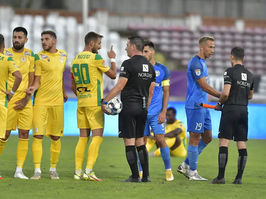 Arbitrul central Andrei Antonie alaturi de Gheorghe Bogdan Rusu, Paul Ovidiu Pirvulescu si Denis Ventura discuta dupa meciul de fotbal dintre Academica Clinceni si CS Mioveni, contand pentru Liga 1 Casa Pariurilor, desfasurat pe Stadionul Dinamo din Bucuresti, luni 30 august 2021. © FOTO:Razvan Pasarica/SPORT PICTURES