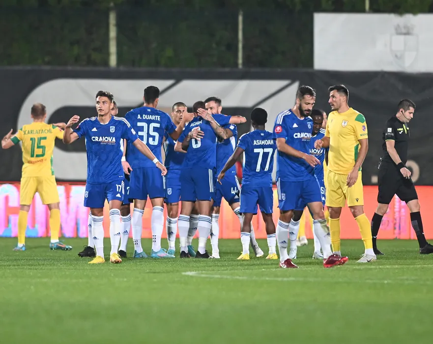 Bucurie a fotbalistilor craioveni dupa un gol marcat cu George Danut Ganea si Gabriel Nicolae Enache spre dezamagirea lui Miluta Stefan Blanaru in meciul de fotbal dintre CS Mioveni si FC U Craiova, contand pentru Superliga Superbet, desfasurat pe Stadionul Orasenesc din Mioveni, sambata 1 octombrie 2022. © FOTO:Razvan Pasarica/SPORT PICTURES