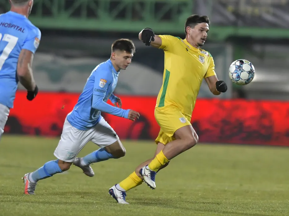 Ion Gheorghe si Alexandru Daniel Buziuc in meciul de fotbal dintre CS Mioveni si FC Voluntari, contand pentru Liga 1 Casa Pariurilor, desfasurat pe Stadionul Orasenesc din Mioveni, vineri 4 februarie 2022. © FOTO:Razvan Pasarica/SPORT PICTURES