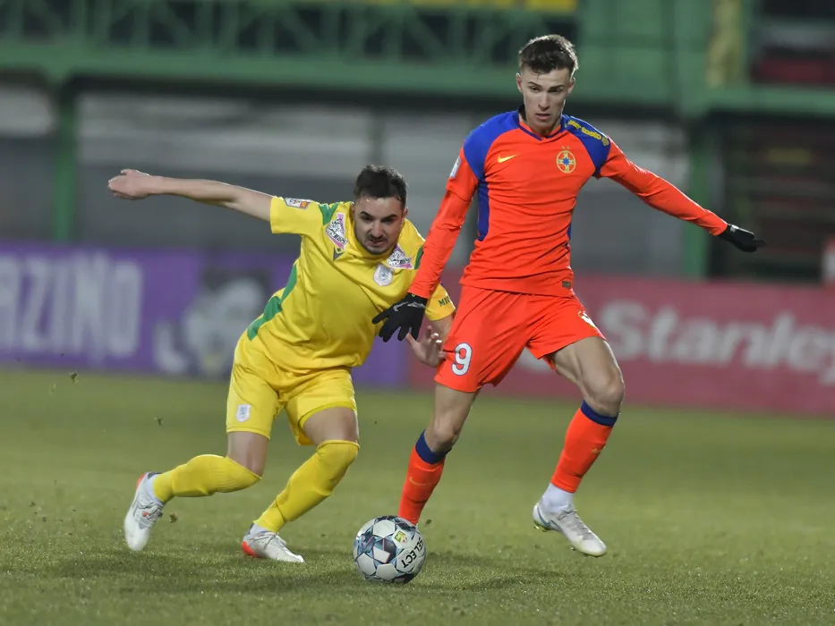 Laurentiu Ionut Radescu si Octavian George Popescu in meciul de fotbal dintre CS Mioveni si FCSB, contand pentru Liga 1 Casa Pariurilor, desfasurat pe Stadionul Orasenesc din Mioveni, sambata 19 februarie 2022. © FOTO:Razvan Pasarica/SPORT PICTURES
