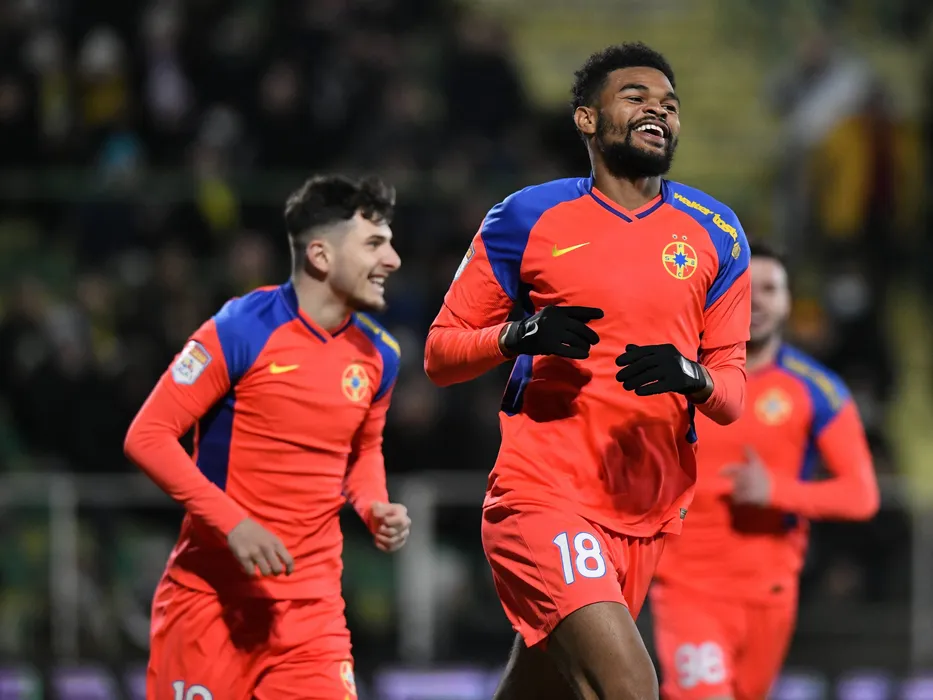 Sylas Laouari Edjouma Malcom se bucura dupa un gol marcat in meciul de fotbal dintre CS Mioveni si FCSB, contand pentru Liga 1 Casa Pariurilor, desfasurat pe Stadionul Orasenesc din Mioveni, sambata 19 februarie 2022. © FOTO:Razvan Pasarica/SPORT PICTURES