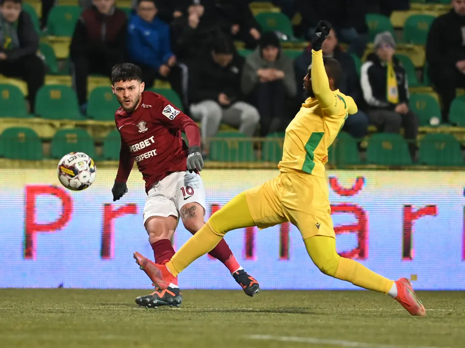 Alexandru Ionita si Shaquill Montell Sno in meciul de fotbal dintre CS Mioveni si Rapid Bucuresti, contand pentru Superliga Superbet, desfasurat pe Stadionul Orasenesc din Mioveni, 17 februarie 2023. © FOTO:Razvan Pasarica/SPORT PICTURES