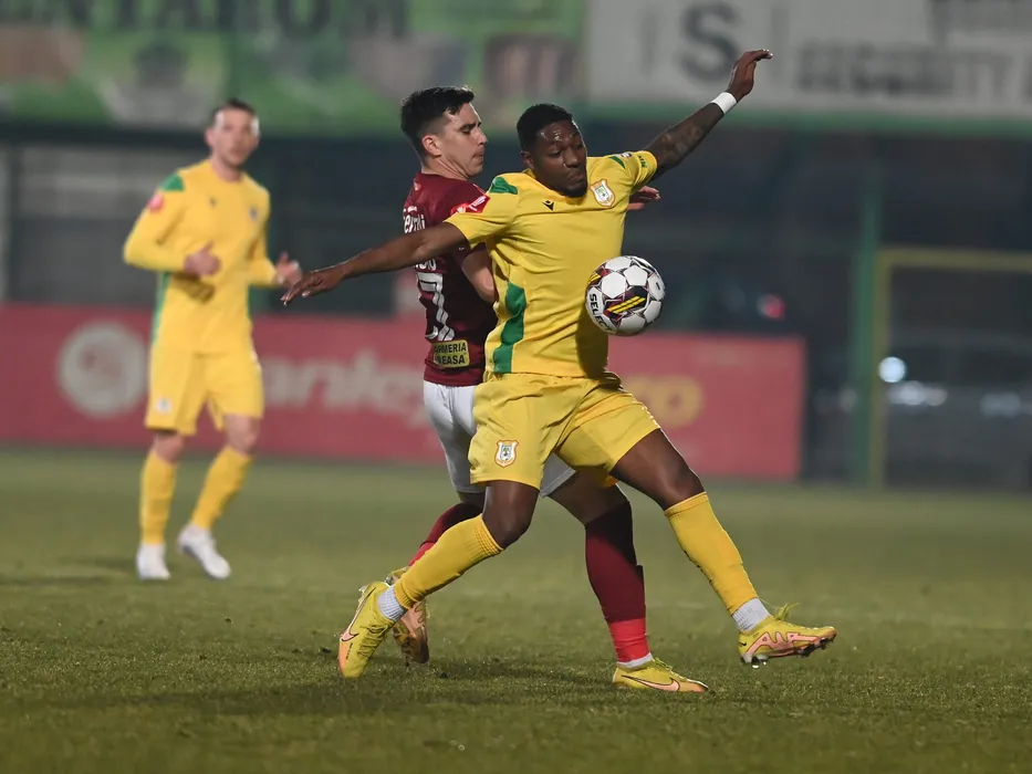 Shaquill Montell Sno si Stefan Calin Panoiu in meciul de fotbal dintre CS Mioveni si Rapid Bucuresti, contand pentru Superliga Superbet, desfasurat pe Stadionul Orasenesc din Mioveni, 17 februarie 2023. © FOTO:Razvan Pasarica/SPORT PICTURES