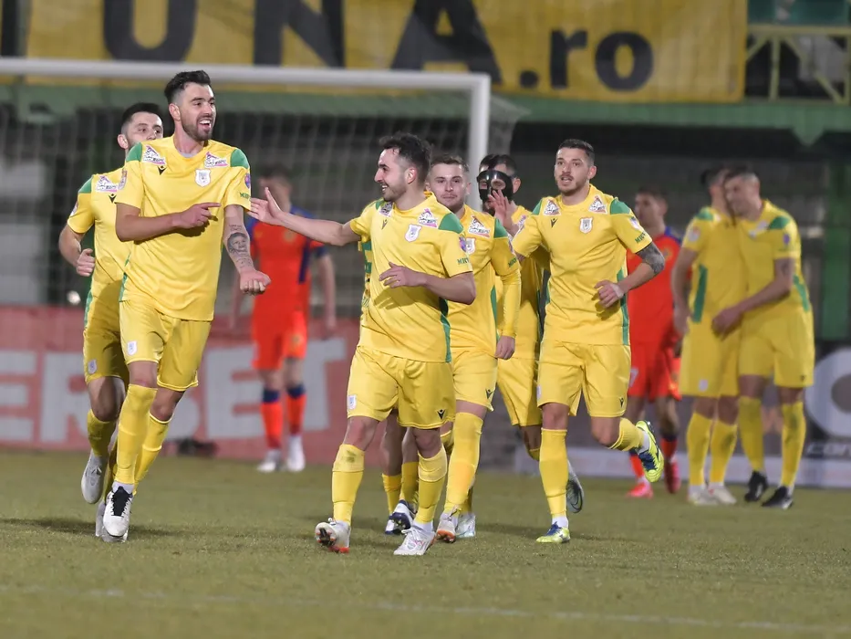 Bucurie a fotbalistilor din Mioveni dupa un gol marcat cu Ionut Balaur, Laurentiu Ionut Radescu, Emanuel Andrei Dat si Szilard Veres in meciul de fotbal dintre CS Mioveni si FCSB, contand pentru Liga 1 Casa Pariurilor, desfasurat pe Stadionul Orasenesc din Mioveni, sambata 19 februarie 2022. © FOTO:Razvan Pasarica/SPORT PICTURES
