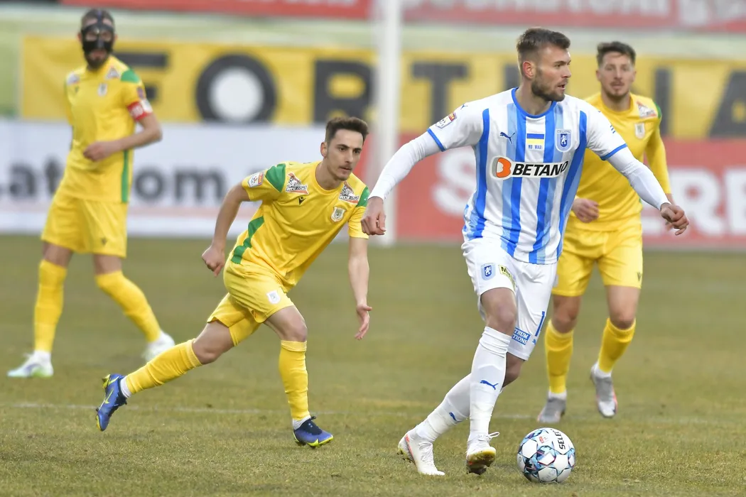 Alexandru Nicusor Raicea si Alexandru Cretu in meciul de fotbal dintre CS Mioveni si Universitatea Craiova, contand pentru Liga 1 Casa Pariurilor, desfasurat pe Stadionul Orasenesc din Mioveni, miercuri 2 martie 2022. © FOTO:Razvan Pasarica/SPORT PICTURES