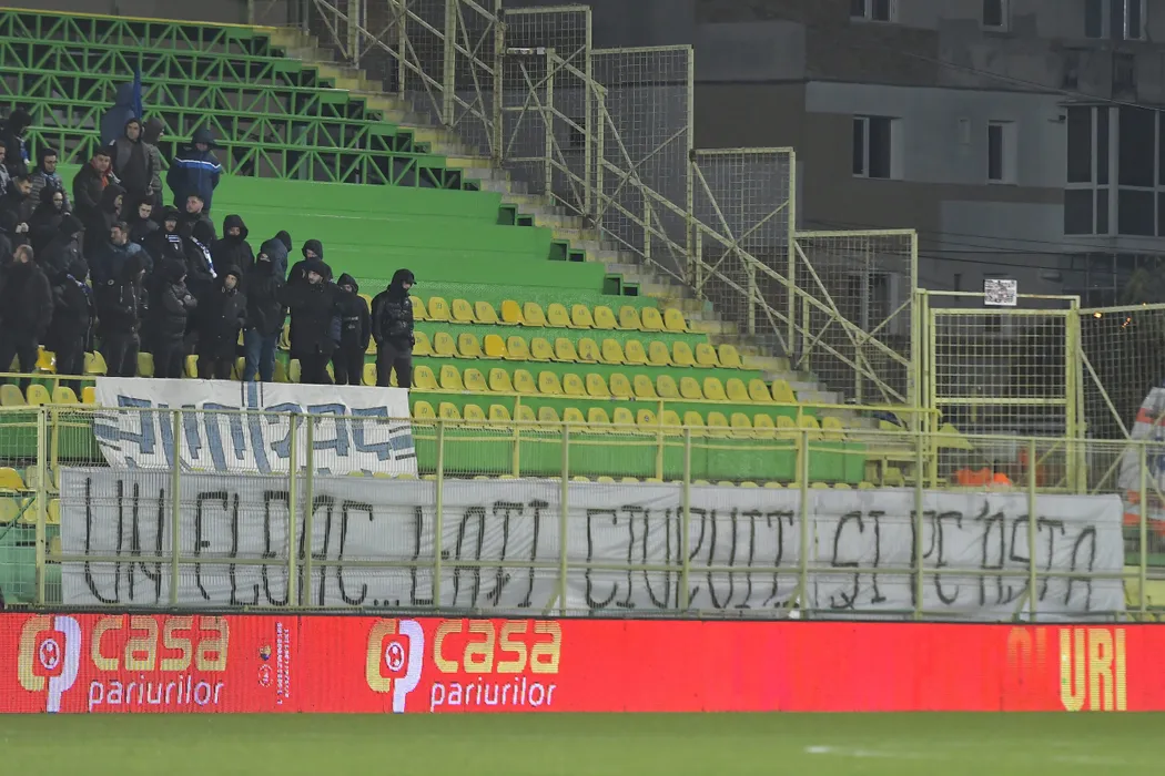Baner al galeriei craiovene afisat la meciul de fotbal dintre CS Mioveni si Universitatea Craiova, contand pentru Superliga Superbet, desfasurat pe Stadionul Orasenesc din Mioveni, luni 12 decembrie 2022. © FOTO:Razvan Pasarica/SPORT PICTURES