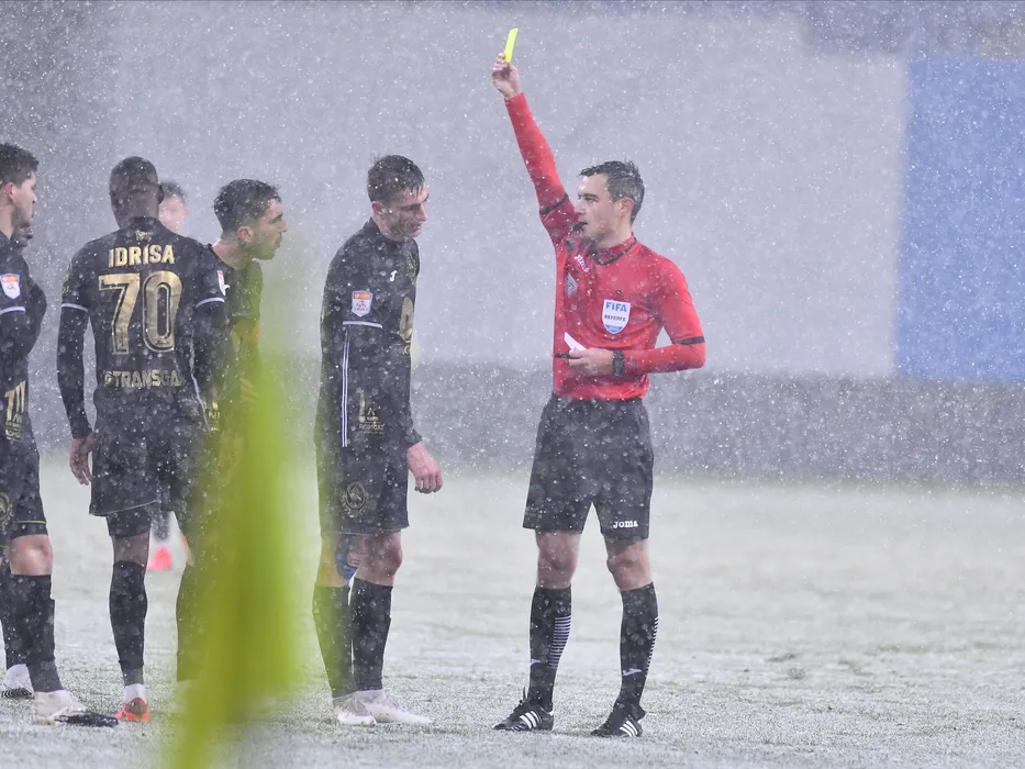 Arbitrul central Mircea Horatiu Fesnic acorda un cartonas galben lui Idrisa Sidi Sambu sub privirile lui Octavian Ronaldo Andrei Deaconu si Ionut Justinian Larie in meciul de fotbal dintre Universitatea Craiova si Gaz Metan Medias, contand pentru Liga 1 Casa Pariurilor, desfasurat fara spectatori pe Stadionul Ion Oblemenco din Craiova, luni 7 decembrie 2020. © FOTO:Razvan Pasarica/SPORT PICTURES