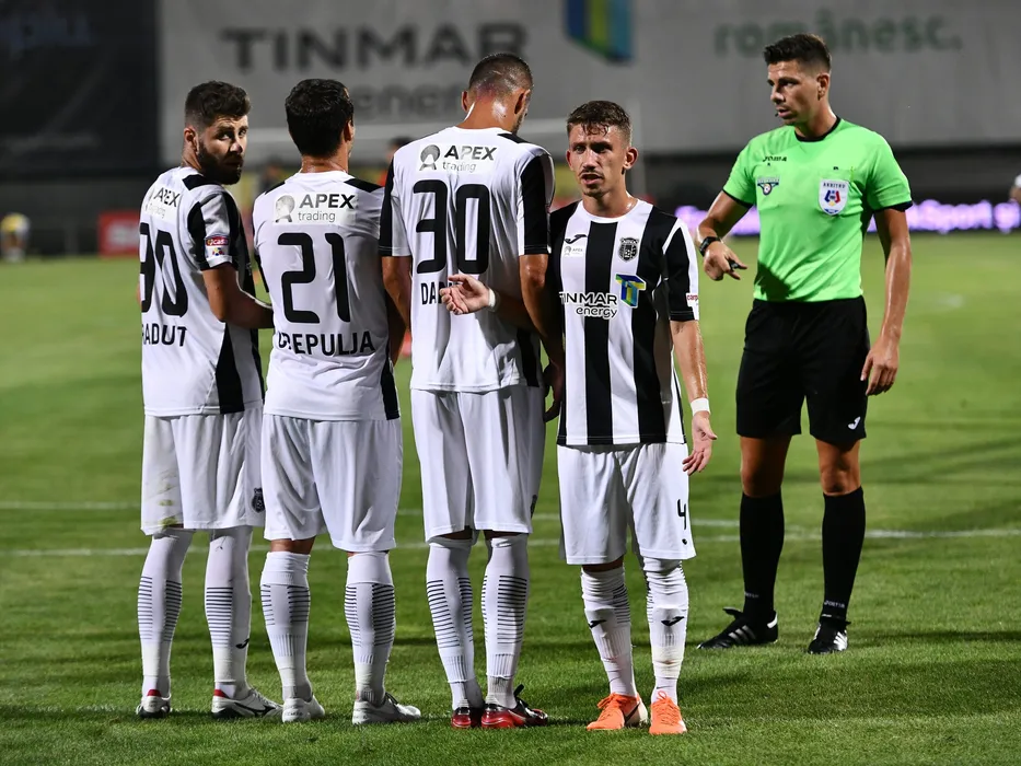Mihai Cosmin Radut si Marius Catalin Pahontu alaturi de arbitrul central Marian Barbu in meciul de fotbal dintre Astra Giurgiu si FCSB, contand pentru Liga 1 Casa Pariurilor, desfasurat pe Stadionul Marin Anastasovici din Giurgiu, sambata 22 august 2020. © FOTO:Razvan Pasarica/SPORT PICTURES