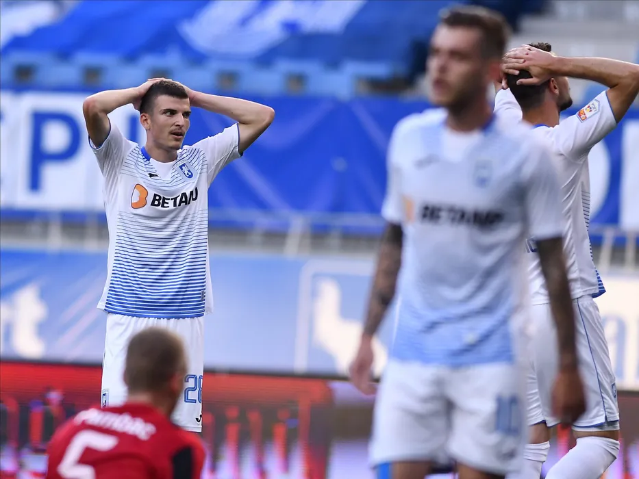 Mihai Valentin Mihaila suparat dupa o ratare in meciul de fotbal dintre Universitatea Craiova si Astra Giurgiu, contand pentru play-off-ul Ligii 1 Casa Pariurilor, disputat fara spectatori pe Stadionul Ion Oblemenco din Craiova, vineri 19 iunie 2020. © FOTO:Razvan Pasarica/SPORT PICTURES