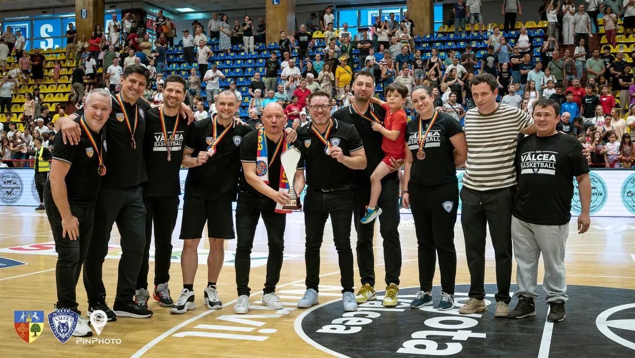 Staff-ul echipei CS Valcea 1924 sarbatoreste victoria echipei dupa finalul partidei a cincea de baschet din finala mica dintre CS Valcea 1924 si CSO Voluntari din LNBM Getica 95, desfasurat la Sala Sporturilor Traian din Ramnicu Valcea in data de 13-Jun-25. Foto credit: Catalin Margarit / PinPhoto