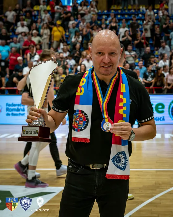 Arturo Alvarez, antrenor principal al echipei CS Valcea 1924 sarbatoreste victoria echipei dupa finalul partidei a cincea de baschet din finala mica dintre CS Valcea 1924 si CSO Voluntari din LNBM Getica 95, desfasurat la Sala Sporturilor Traian din Ramnicu Valcea in data de 13-Jun-25.
