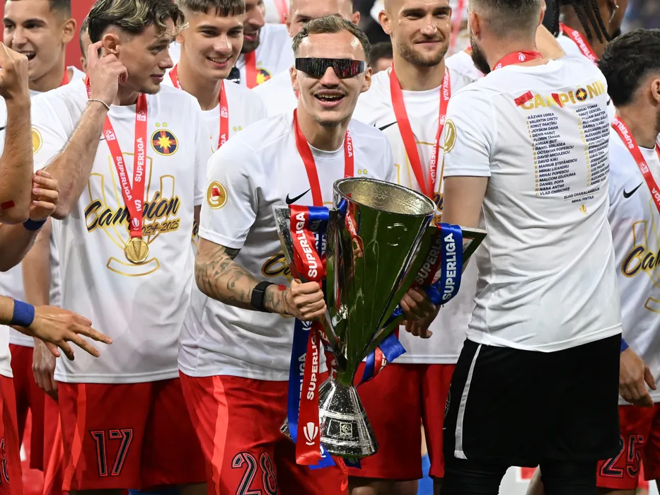 Fotbalistii ros-albastrii alături de Grigoraș Alexandru Pantea celebreaza castigarea Superligii Superbet in urma meciului dintre FCSB si Universitatea Craiova, din cadrul Play off-ului competitiei, desfasurat pe Arena Nationala din Bucuresti, sambata 17 mai 2025. © FOTO:Razvan Pasarica/SPORT PICTURES