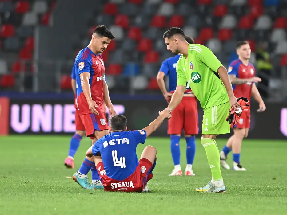 Fotbalistii stelisti Alexandru Buziuc, Dean Beta si Ionut Pop suparati dupa meciul de fotbal dintre CSA Steaua Bucuresti si CSM Slatina, contand pentru Liga a-2-a Casa Pariurilor, desfasurat pe Stadionul Steaua-Ghencea din Bucuresti, luni 25 septembrie 2023. © FOTO:Razvan Pasarica/SPORT PICTURES