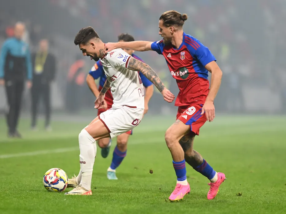 Alexandru Cristian Albu si Stephan Draghici in meciul de fotbal dintre CSA Steaua Bucuresti si Rapid Bucuresti, contand pentru Cupa Romaniei Betano, desfasurat pe Stadionul Steaua-Ghencea din Bucuresti, miercuri 1 noiembrie 2023. © FOTO:Razvan Pasarica/SPORT PICTURES