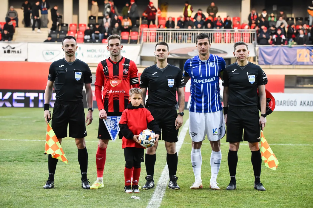 Brigada de arbitri formata din Ferencz Tunyogi, Rares George Vidican si Ioan Alexandru Corb alaturi de capitanii Attila Csürös si Ionut Justinian Larie la startul meciului de fotbal dintre FK Csikszereda Miercurea Ciuc si FC Farul Constanta, contand pentru Superliga Superbet Play-Out, desfasurat pe Stadionul Municipal din Miercurea Ciuc, sambata 21 martie 2026. © FOTO:Zoltan Pal/SPORT PICTURES
