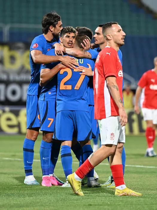 Bucurie a fotbalistilor stelisti dupa un gol marcat cu Andrea Compagno, Florinel Teodor Coman si Adrian Gheorghe Sut in meciul de fotbal dintre TSKA 1948 Sofia si FCSB, din cadrul UEFA Europa Conference League, desfasurat pe Stadionul National Vasil Levski din Sofia, miercuri 26 iulie 2023. © FOTO:Razvan Pasarica/SPORT PICTURES