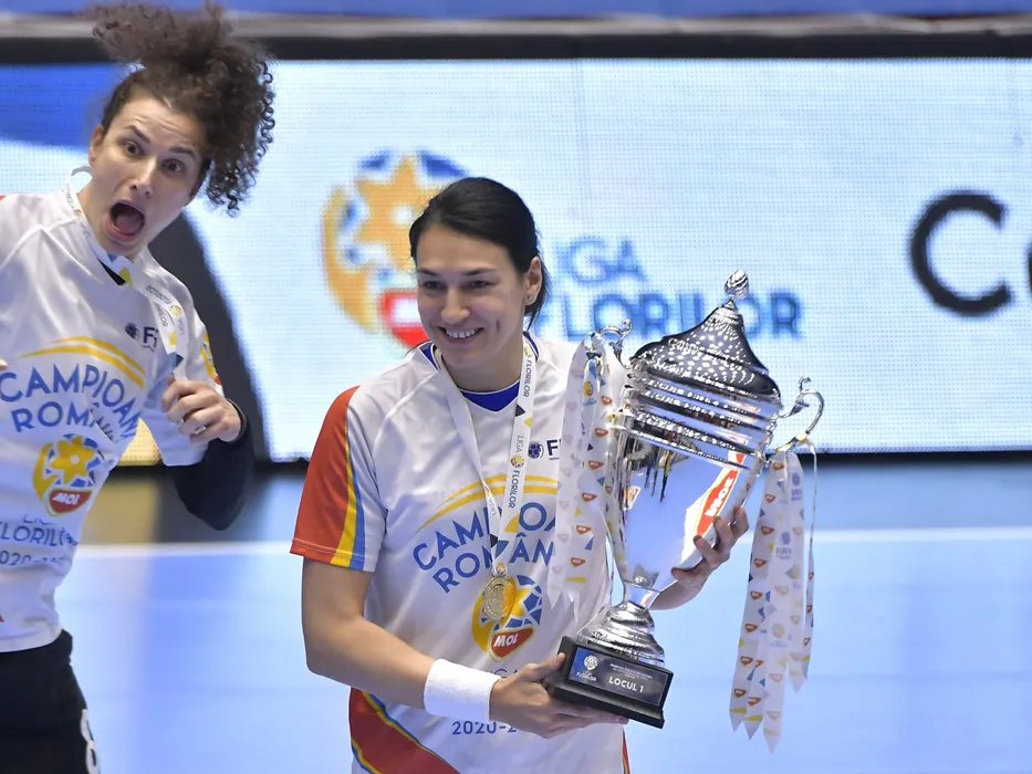 Handbalistele de la CSM Bucuresti Jelena Grubisic si Cristina Georgiana Neagu se bucura dupa castigarea campionatului alaturi de trofeu in urma meciului de handbal feminin impotriva celor de la SCM U Craiova, contand pentru Liga Florilor, desfasurat fara spectatori in Sala Ioan Kunst Ghermanescu-Polivalenta din Bucuresti, luni 31 mai 2021. © FOTO:Razvan Pasarica/SPORT PICTURES