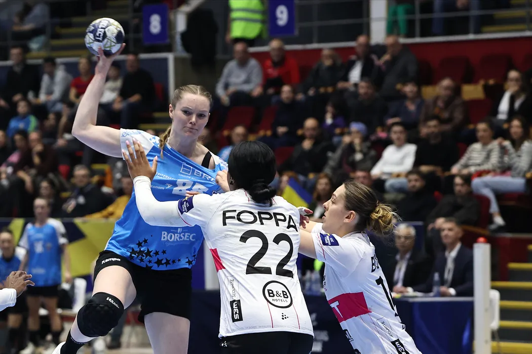 Anne Mette Hansen si Pauletta Foppa, Enola Borg in meciul de handbal feminin dintre CSM Bucuresti si Brest Bretagne Handball, contand pentru Liga Campionilor, desfasurat in Sala Polivalenta Ioan Kunst Ghermanescu din Bucuresti, duminica 8 februarie 2026. © FOTO:Gheorghe Fluster/SPORT PICTURES